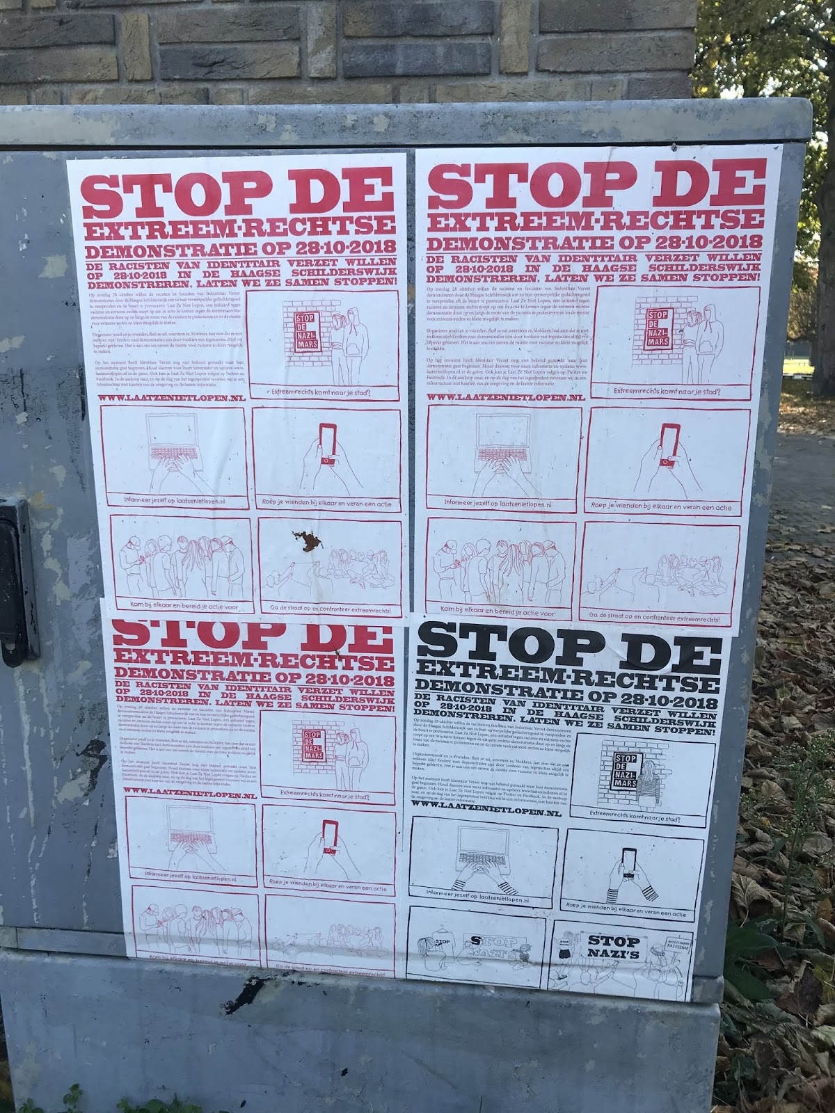 De afgelopen tijd heeft het initiatief tegen racisme LaatZeNietLopen.nl duizenden flyers en posters verspreid in de Haagse Schilderswijk. Hiermee informeerden ze buurtbewoners over de geplande extreem-rechtse demonstratie op 28 oktober, ook roept LaatZeNietLopen.nl buurtbewoners op om in actie te komen tegen de komst van racisten en fascisten naar hun wijk.