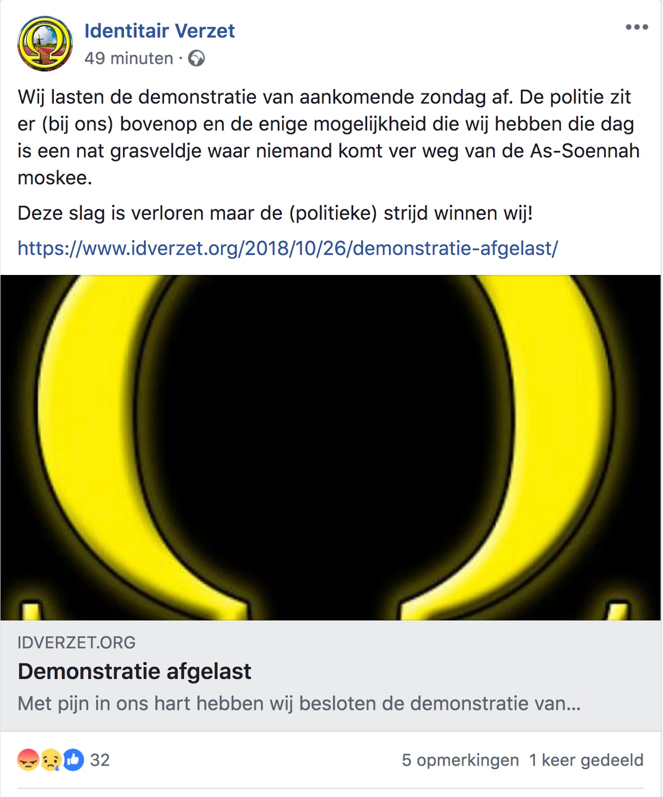 We zien het aflassen van de extreem-rechtse demonstratie als een overwinning voor al het antifascistisch straatwerk dat gedaan is. Al zijn wij van mening dat het aan ons is als mensen om extreem-rechts van de straat te houden en dat dit niet de taak van een burgemeester of overheid moet zijn. Ook als Identitair Verzet naar de Schilderswijk was gekomen hadden we, samen met buurtbewoners, alles op alles gezet om dit te stoppen.